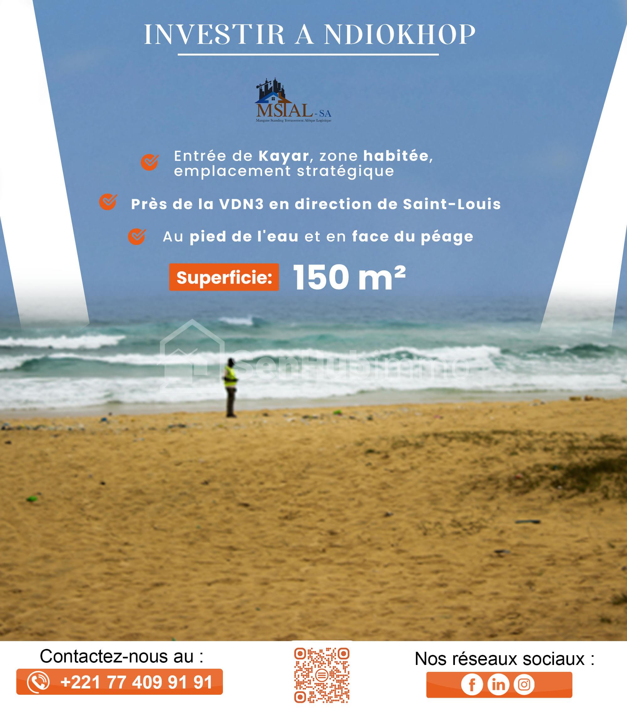 Pourquoi choisir Ndiokhop ? Localisation privilégiée : Entrée de Kayar, en face du péage et proche de la VDN3 en direction de Saint-Louis Zone habitée : Quartier en plein développement avec un accès rapide par la voie de Bayakh Cadre idéal : Climat agréable toute l’année, proche de l’eau Infrastructures disponibles : Électricité et eau déjà sur place Ne ratez pas cette occasion d’investir dans l’avenir ! Contactez-nous dès maintenant au 77 409 91 91 pour plus d’informations ou une visite du site.
